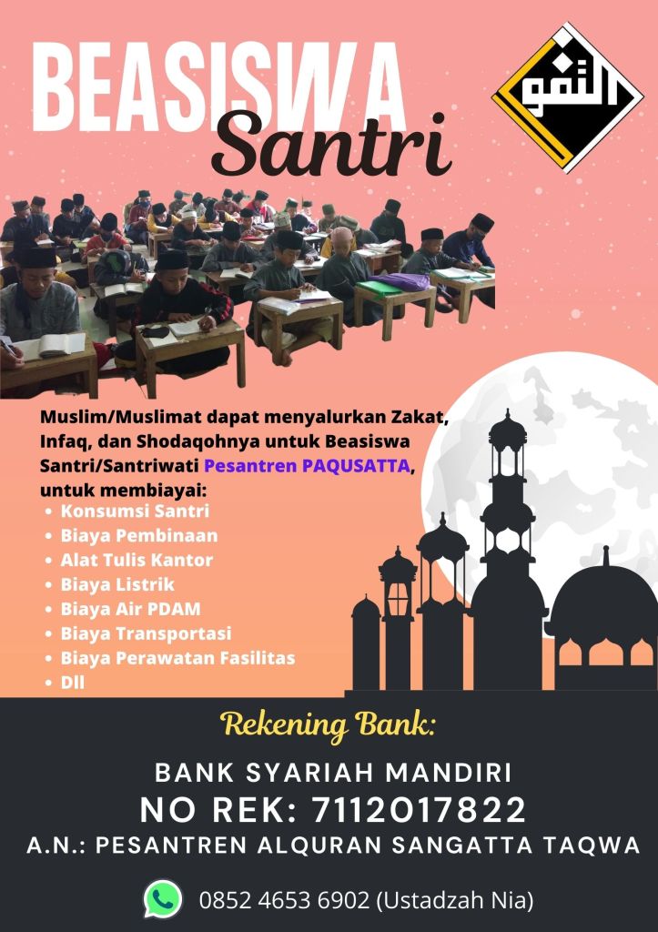 Pesantren PAQUSATTA mengundang Bapak/Ibu untuk menyalurkan zakat, infaq, dan shodaqoh untuk beasiswa santri-santriwati dengan latar belakang keluarga tidak mampu (yatim piatu dan dhuafa), yang akan digunakan untuk mendukung kebutuhan pembinaan harian mereka seperti: seragam, makan, buku, listrik, air, pembinaan harian, dll.