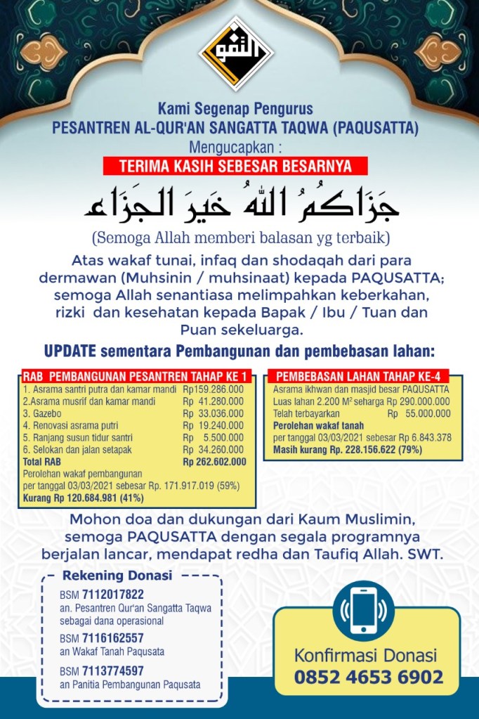 Pesantren PAQUSATTA mengundang partisipasi ummat untuk pembebasan lahan dan pembangunan fasilitas pesantren dalam bentuk wakaf lahan dan pembangunan